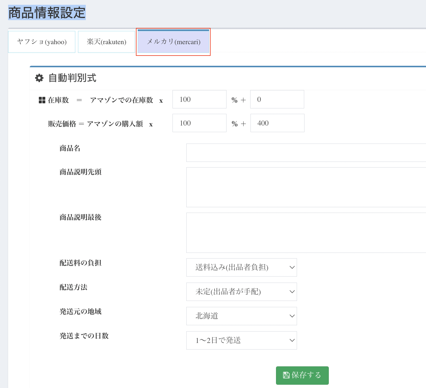 併売機能→商品情報設定画面を開いて、メルカリショップのタブを選択してください。